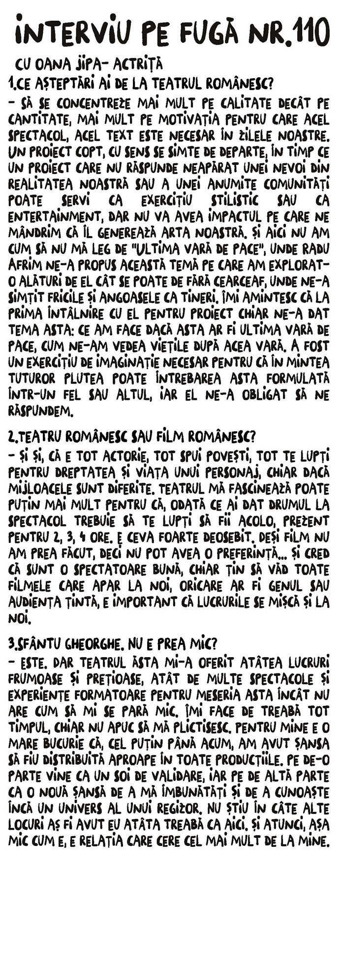Iar în ceea ce priveşte actorii, Oana Jipa, Costi Apostol, Mădălina Mușat, Eduard Crucianu, Bogdan Ifodi, Anastasia Florea, Robert Brage sunt impecabili. Rar să nu poţi nominaliza performanţele unuia/uneia prin comparaţie cu ale altuia/alteia. Dar tocmai faptul că funcţionează atât de bine împreună, până la a construi din prezenţa lor comună un personaj în sine, fără a-şi pierde niciunul – niciuna individualitatea este cea mai mare laudă. O distribuţie în care să nu poţi reproşa nimic nimănui şi în care să nu îţi fie posibil să preferi pe cineva anume este foarte rară. Iar Teatrul „Andrei Mureşanu” Sfântu Gheorghe este unul dintre puţinele teatre care se poate lăuda, la nivel de trupă, cu astfel de echilibre perfecte, realizate din tipologii eterogene, dar bazate pe nivel profesional comparabil, la un nivel atât de bun încât greu să se poată depăşi unii pe alţii. Poate tocmai pentru că sunt atât de buni şi regizorul Radu Afrim a părut, pe alocuri, că nu s-a putut opri din a le mai scrie nişte replici şi a le mai da un moment în plus de strălucire fiecăruia, riscând să mai piardă din tensiune la cei mai puţin răbdători din public. Dar, ca de obicei, pe aceştia îi recuperează cu momentele de comedie.