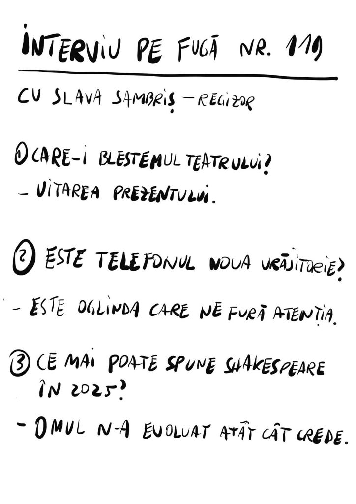 Nu ştiu dacă Slava Sambriş şi-a imaginat acest spectacol şi ca pe un pariu cu spectatorul că teatrul poate crea o experienţă care să concureze cu telefonul, dar sunt multe scene în care experienţa teatrală se insinuează în conştiinţa acestuia şi îl duce cu ea la fel de hipnotic precum deviceurile noastre multiubite. Şi o face, lucru demn de semnalat, cu minimum de proiecţie video. Prima proiecţie video a apărut când tocmai felicitam în mintea mea spectacolul că a renunţat la acest instrument, dar calitatea şi adecvarea ei în construcţie m-a fascinat aproape în mod egal precum pe Macbeth, aderând astfel la himera lui. El vâzând cu ochii gândul crimei care îl va înălţa în rang, eu urmărind dacă sângele ce se scurge pe perdea va păta podeaua. Dar ambii captivi într-o himeră.
