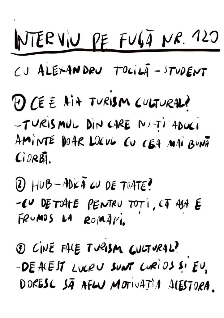 Acum că aţi digerat informaţia, mai ales managerii culturali şi de patrimoniu, să o gândim din altă perspectivă, pentru a înţelege că, precum toate ideile cu adevărat bune, îţi vine să spui – cum de nu s-a făcut până acum? Eşti într-un loc străin. Oraş sau sat, nu ştii pe nimeni, nu ştii locul, nu ştii ce poţi face acolo. Eşti cu treabă, dar ai terminat-o. Ai câteva ore sau un rest de zi de stat acolo. Pleci, să zicem, mâine dimineaţă. Te mai plimbi de nebun pe străzi, dar nici nu te-ai îndepărta de centru. Ce să faci cu tine? Nici să te retragi în cameră şi să stai pe telefon n-ai chef, dar nici nu ştii ce ar fi interesant de făcut. Intri pe Romania Hub Cultural şi vezi dacă e ceva de făcut în zona, unde, la ce distanţă etc. Poate descoperi că eşti lângă satul bunicilor lui Enescu. Sau că eşti la două străzi de Muzeul radioului. Cine ştie?  Altfel, cine îşi aminteşte de un drum în care nu s-a întâmplat nimic? Pentru că, serios, vă amintiţi unde aţi mâncat cea mai bună ciorbă din viaţa voastră?