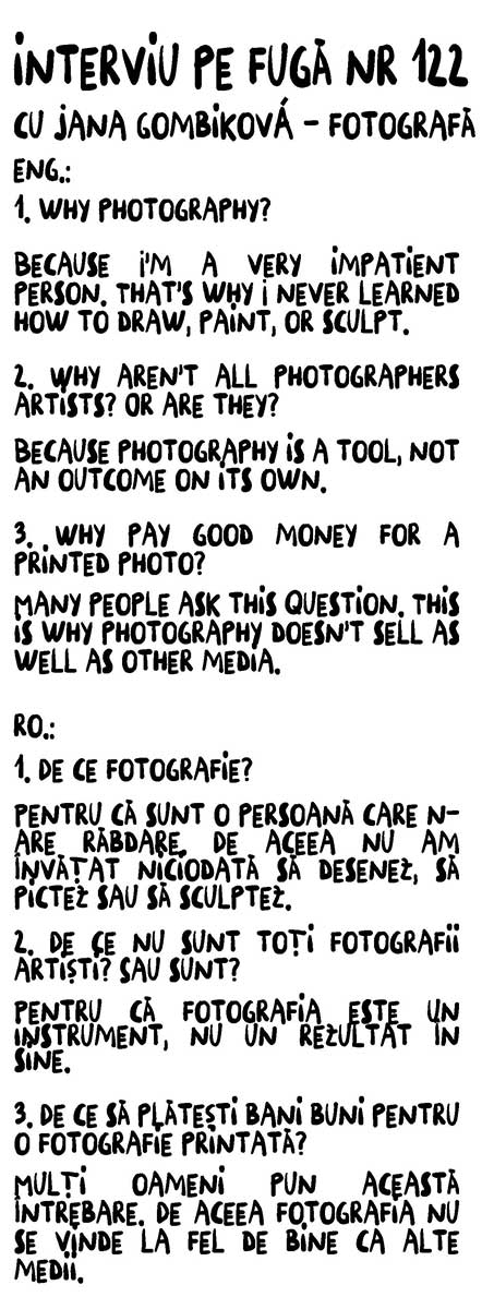 În proiectul Janei Gombiková, fotografia operează în mod similar: imaginile se multiplică, reapar în diferite variaţiuni şi se procesează una pe alta. Dipticuri, tripticuri, repetiţii – nu sunt doar instrumente formale, ci metafore pentru o memorie ramificată, o memorie care nu reproduce niciodată identic un eveniment, ci creează variante, mutaţii şi parafraze.