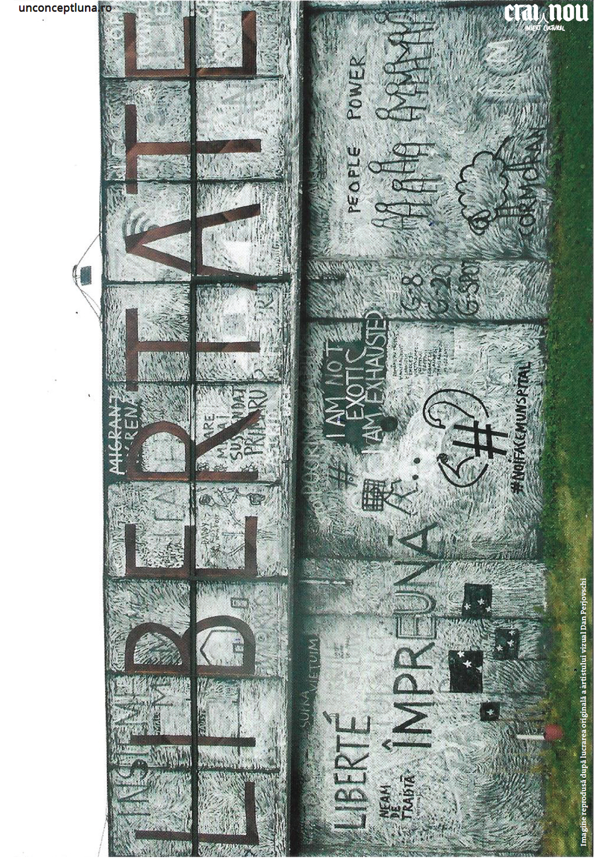 „CETĂȚENI! TREBUIE SĂ FIM CONȘTIENȚI DE ROLUL NOSTRU ÎN SOCIETATE ȘI SĂ SPUNEM UN NU HOTĂRÂT STĂRILOR DE LUCRURI CE SE CONTUREAZĂ LA NOIˮ e un fragment dintr-unul din mesajele scrise cu cretă albă de Mugur Călinescu în 1981.