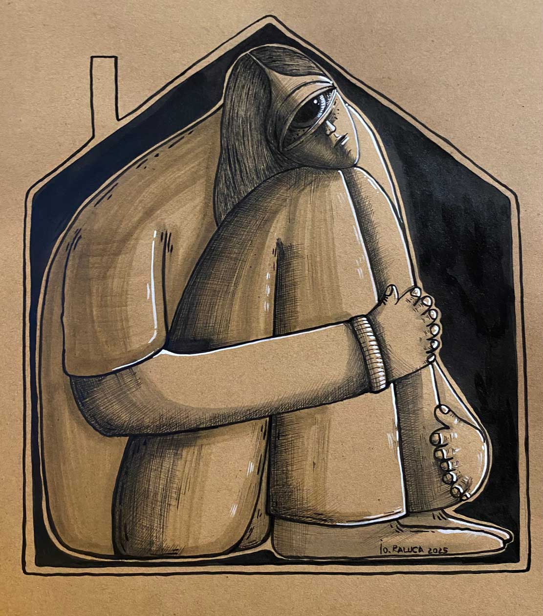 Tehnică: Tuș negru si alb pe hîrtie cartonată