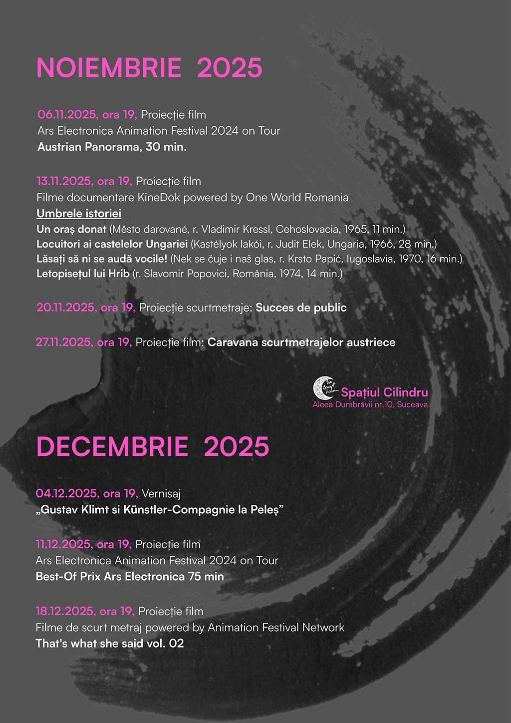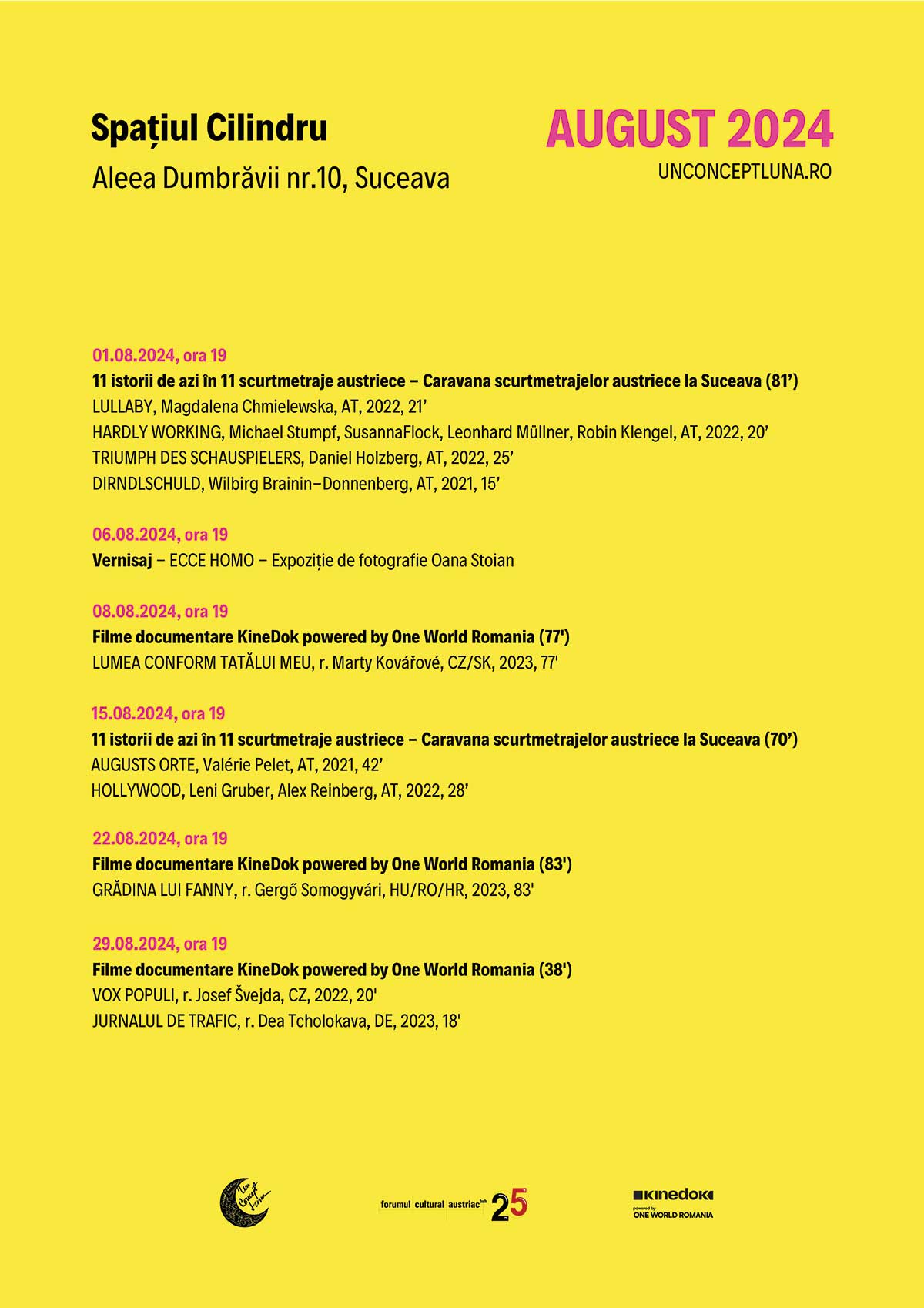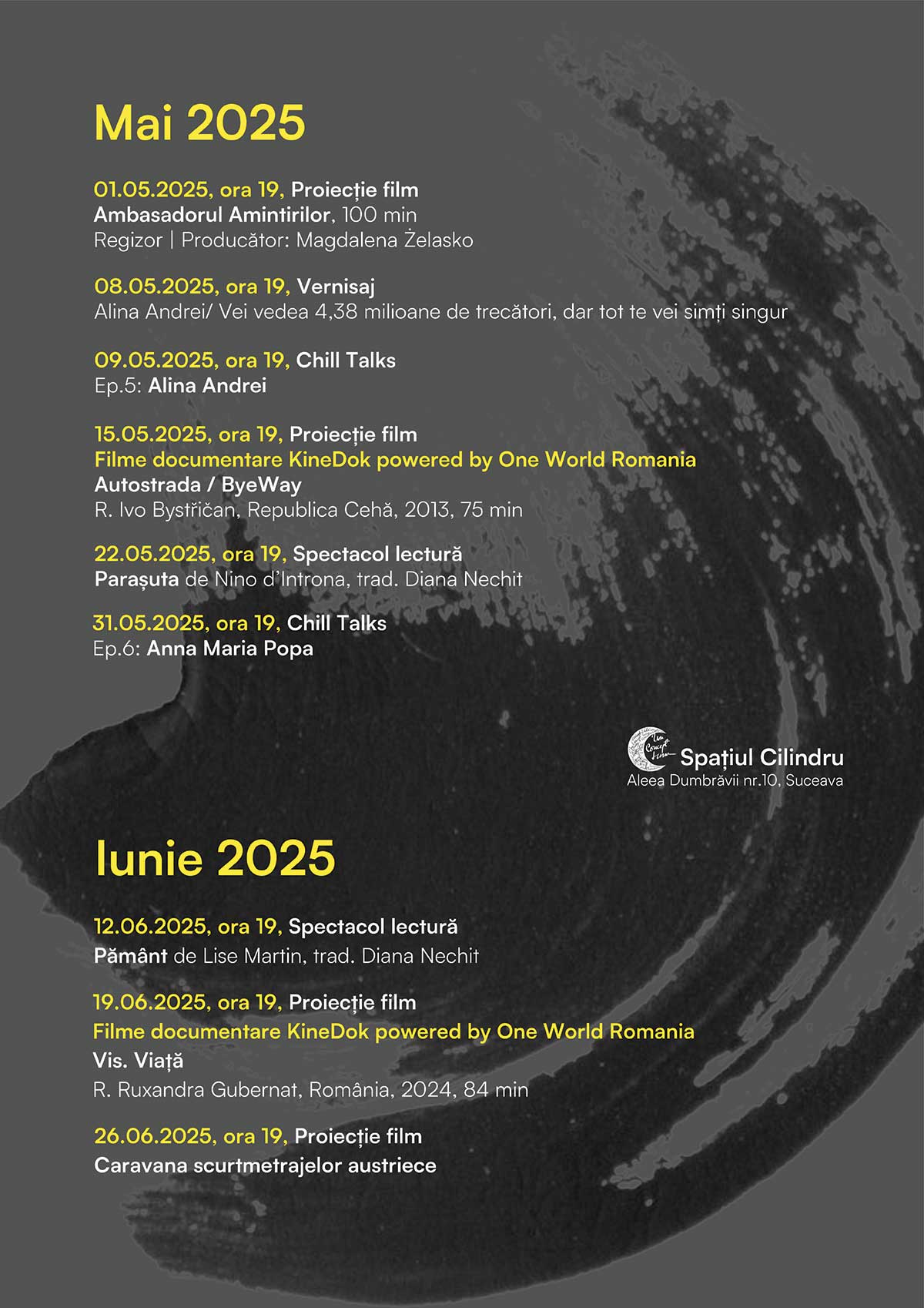 Ne propunem să aducem publicului sucevean tot ce ne stă în putere din ce ne lipseşte nouă din oferta culturala suceveană. Vă aşteptăm la Spaţiul Cilindru al Asociaţiei Un concept Luna, în Aleea Dumbrăvii, Nr. 10, Suceava, în fiecare joi şi la toate evenimentele noastre. Găsiţi locaţia pe Waze, GoogleMaps. Găsiţi programul şi evenimentele noastre pe conturile de Facebook şi Instagram ale Asociaţiei Un Concept Luna, pe canalul whatsapp al Asociaţiei, pe care vă invităm să îl urmăriţi şi pe unconceptluna.ro.